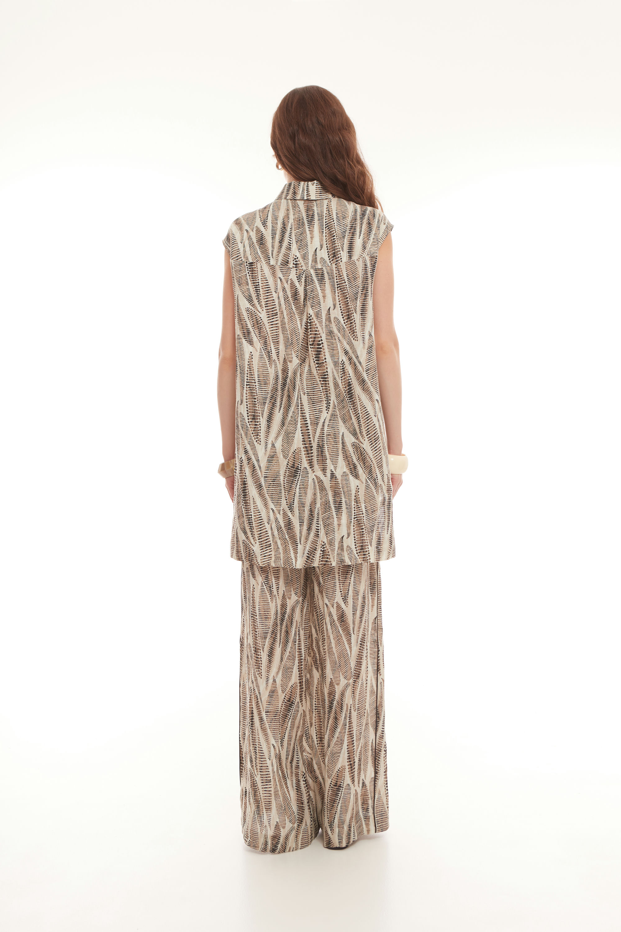 Блузка женская прямого силуэта, удлиненная, с разрезами по боковым швам. Без рукавов, проймы окантованы. Воротник рубашечный, по шву втачивания верхнего воротника в горловину вставлен отделочный кант. По переду застежка цельнокроеная на петли и пуговицы, нагрудные вытачки. По спинке встречная складка, идущая от кокетки. По низу широкая подгибка.