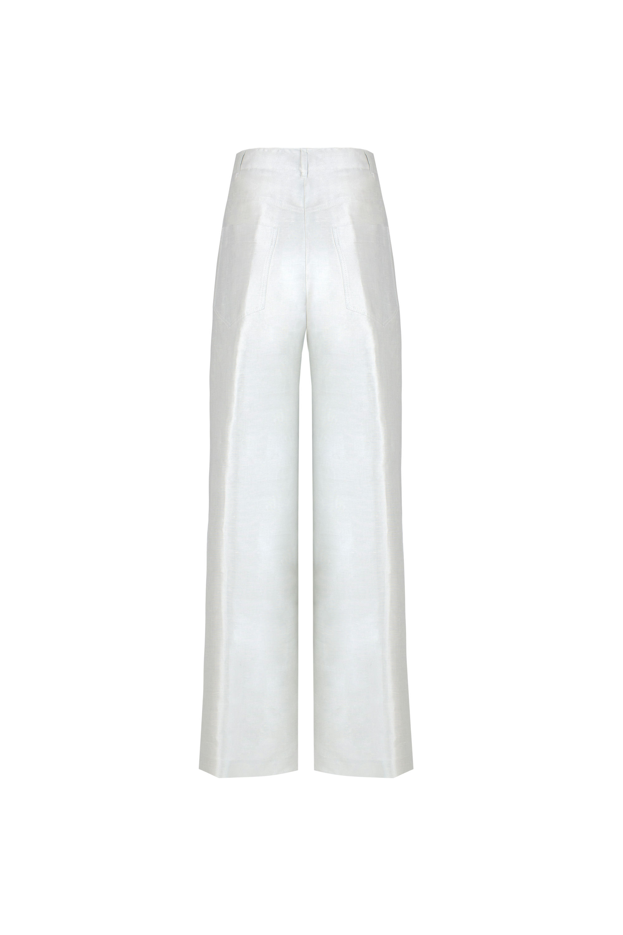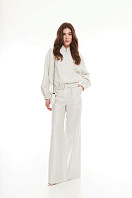 Брюки женские расширенные к низу. Передние половинки брюк с боковыми наклонными карманами и декоративным клапаном. Задние половинки брюк с кокеткой и накладными карманами. Брюки застегиваются на молнию, брючный крючок и потайную пуговицу.