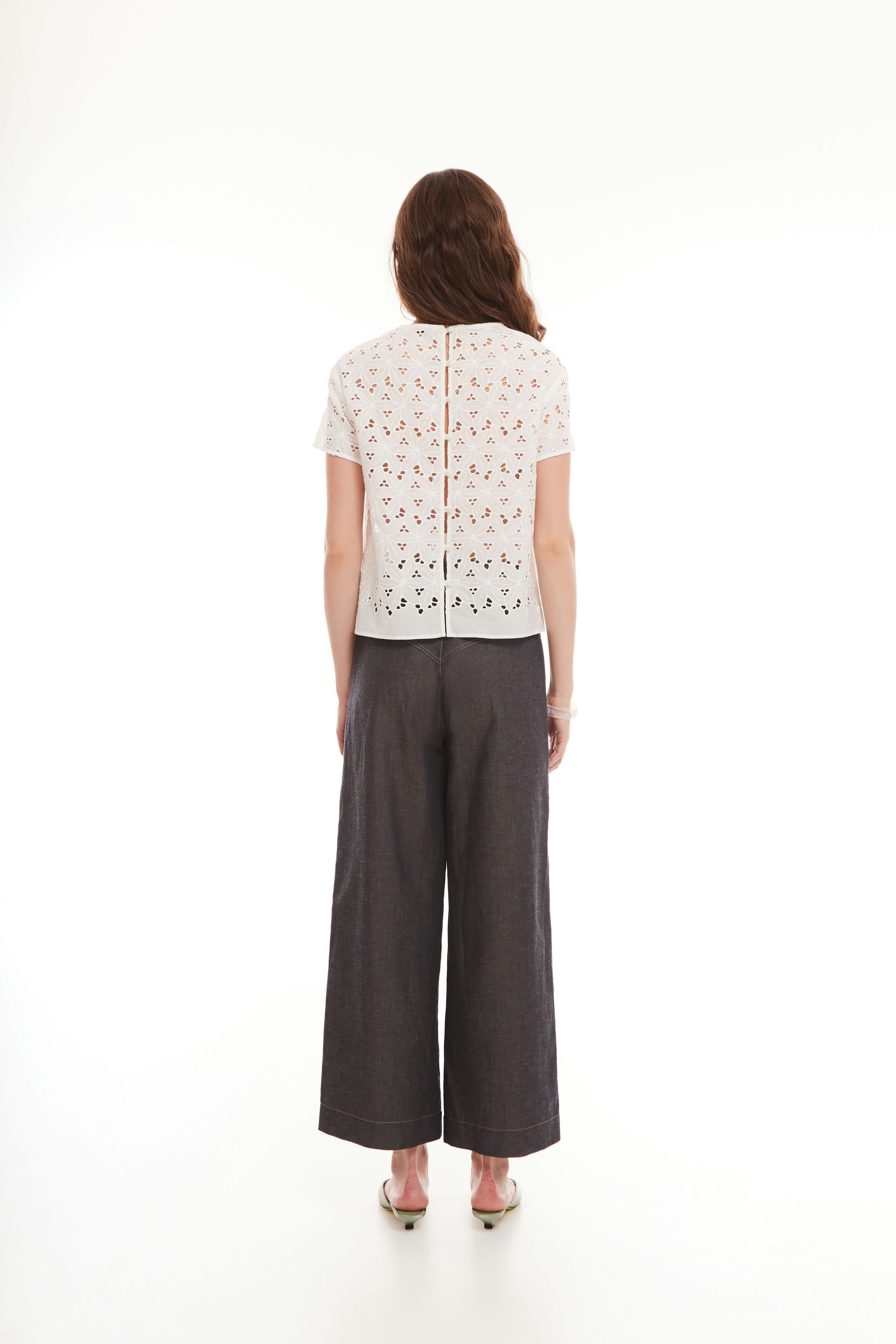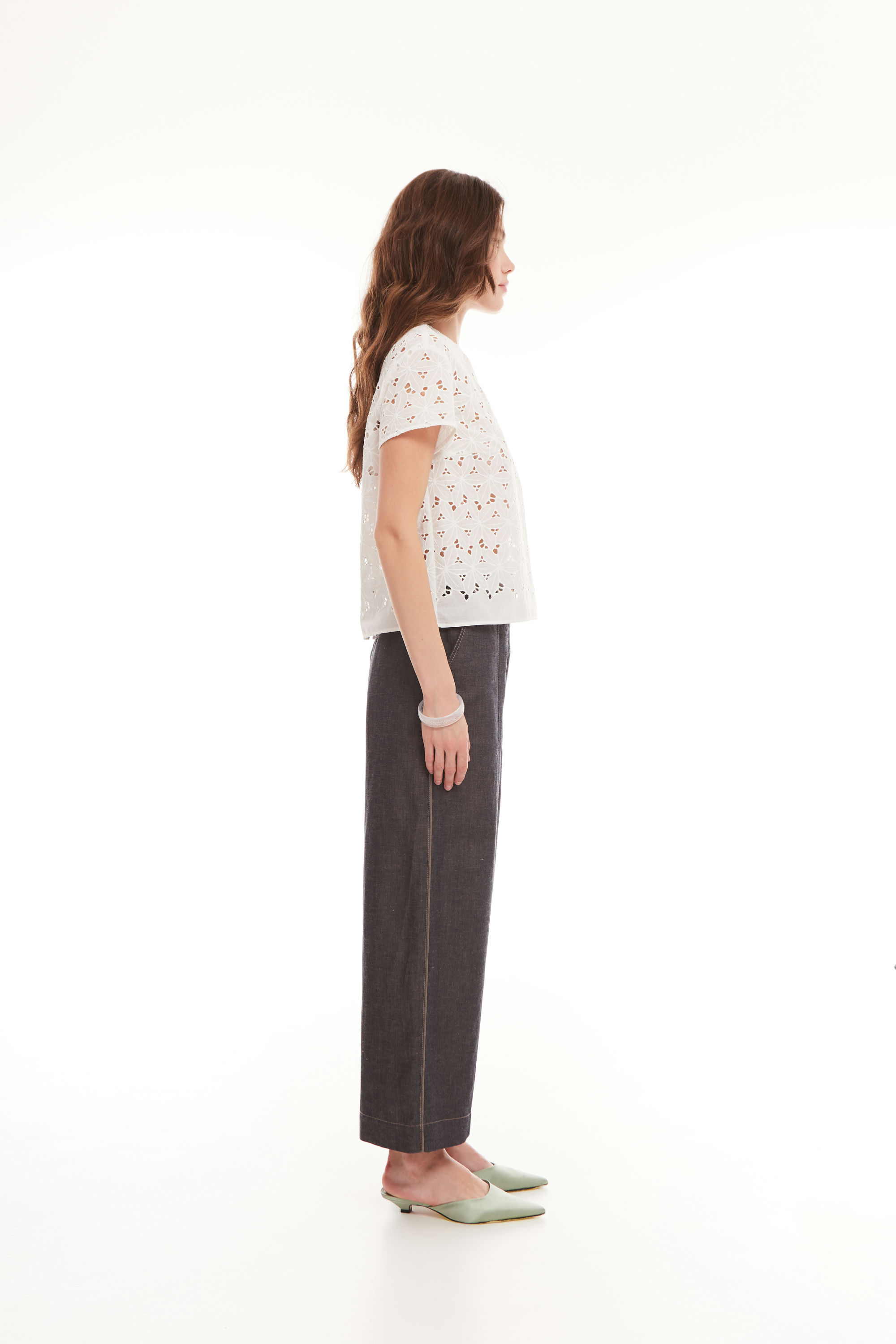Капри женские прямые, с рельефам по передней половинке. Наклонные карманы спереди и задний прорезной карман с листочкой. Задняя половинка брюк с кокеткой. По боковым швам отделочный кант. Застежка на молнию и две пуговицы.