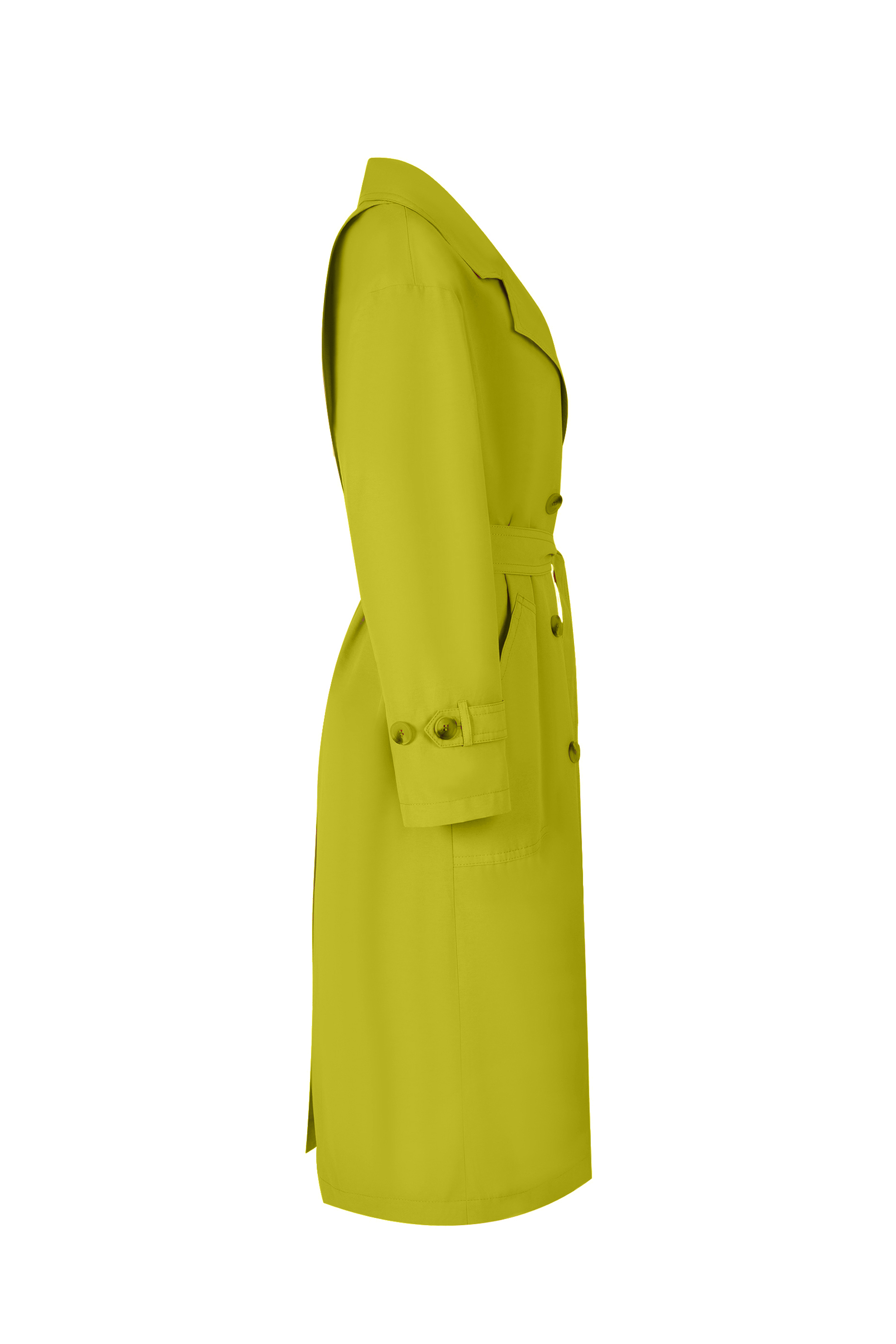 Плащ женский, двубортный, длиной ниже колена, на подкладке. Застежка на петли и пуговицы. На переде накладные карманы. Спинка с отлетной кокеткой. По среднему шву спинки шлица. Рукав длинный втачной, по низу пата застегивающаяся на пуговицы. Воротник и лацкана отложные. В комплекте пояс.