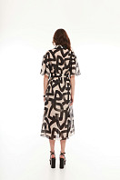 Платье женское, свободного кроя, расширенного к низу силуэта, длиной по щиколотку. По переду застежка на петли пуговицы, нагрудные вытачки. По низу боковых швов разрезы. Воротник- рубашечный. Рукав одношовный, короткий со сборкой по окату. В комплекте с поясом и нижним платьем на регулируемых бретелях.