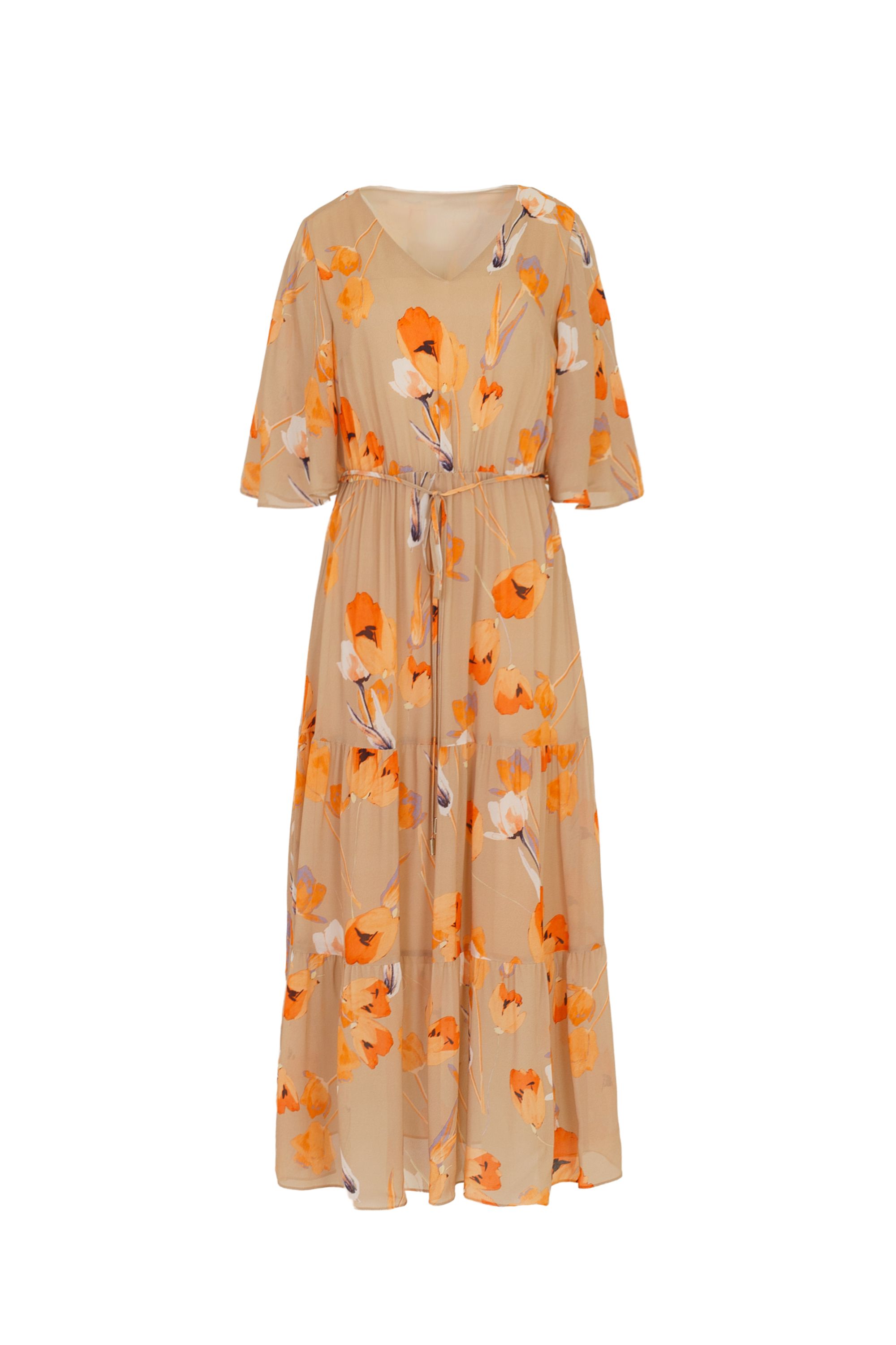 Платье женское, расширенное книзу, длиной макси. Нижние части переда и спинки с притачными воланами на сборке. Платье отрезное по талии и на резинке. По боковым швам шлевки, в которые вдет пояс. Рукава втачные, расширенные книзу. Платье на подкладке.