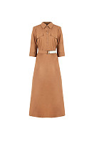 Платье женское А-силуэта, длина «миди». По переду планка застёгивается на петли и пуговицы. Перед и спинка в верхней части с отрезной кокеткой: в шве притачивания кокетки переда - клапана, застегивающиеся на петлю и пуговицу. В шве притачивания кокетки спинки - встречная складка. Карманы в боковых швах. В нижней части боковых швов разрезы. Воротник рубашечного типа. Рукав втачной длиной ¾. В комплекте съемный пояс.