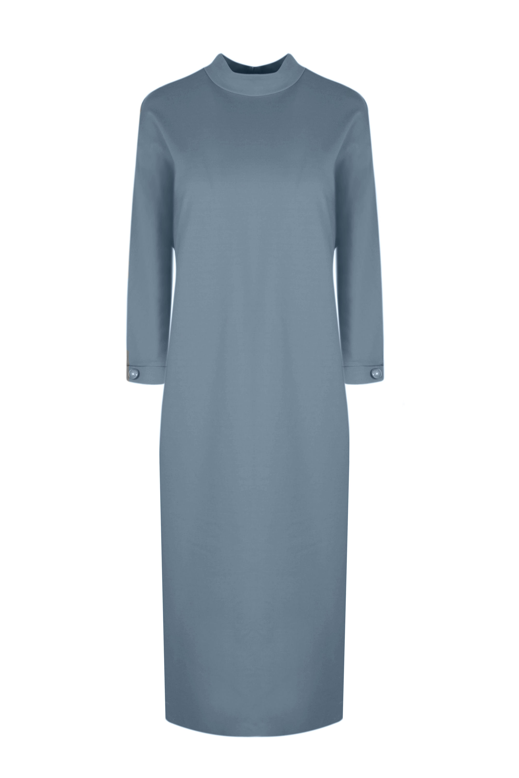 Платье женское прямого силуэта, длиной ниже колена. Рукава цельнокроеные с притачной манжетой. Воротник стойка. На спинке застежка потайная молния, в нижней части среднего шва спинки разрез.