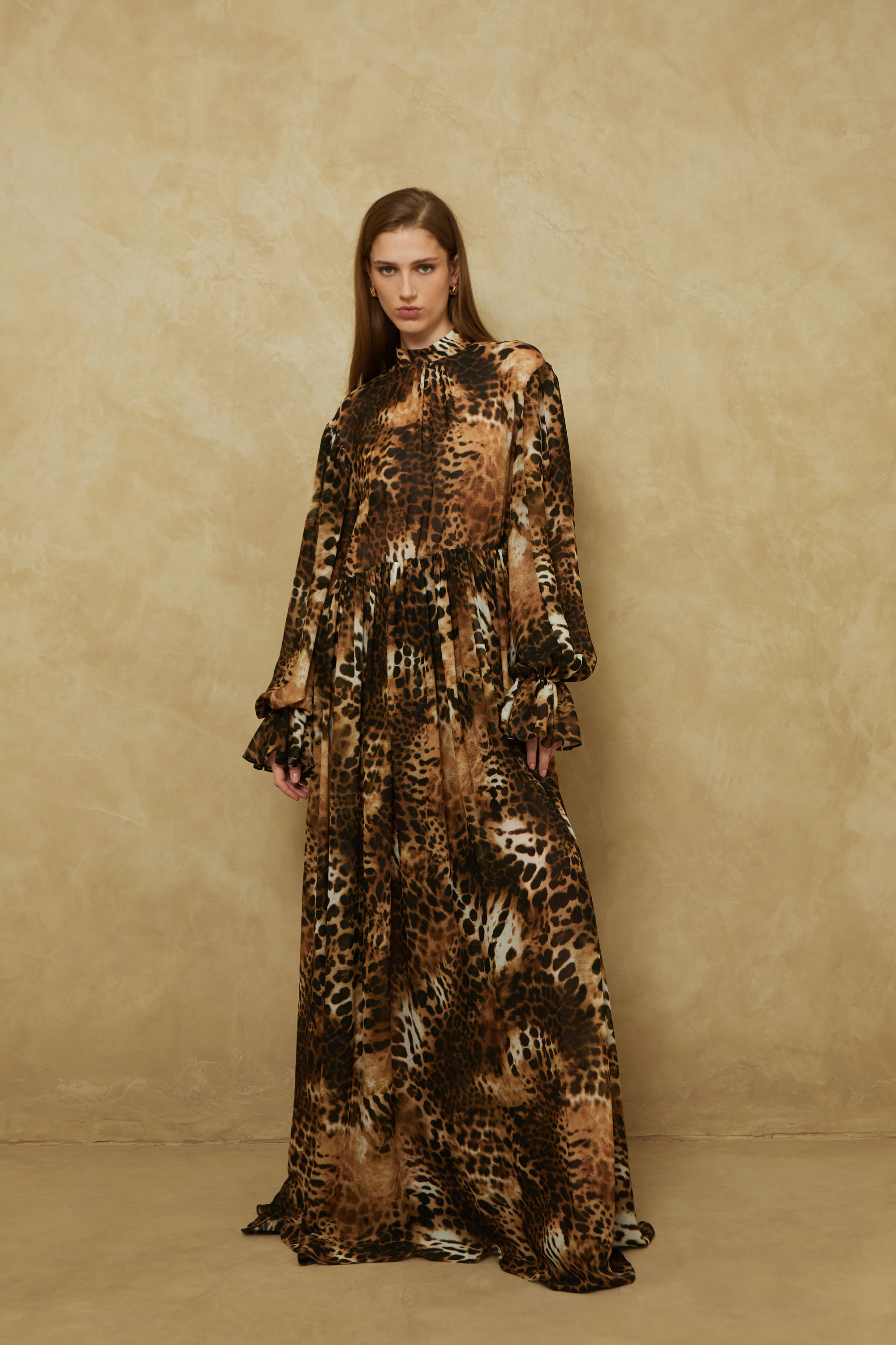 Платье женское, длиной макси, на подкладке. Перед и спинка по талии собраны на резинку. В верхней части спинки по среднему шву разрез. Рукав втачной, одношовный, по окату и низу собран на сборку. Воротник стойка, на спинке застегивается на две навесные петельки и пуговицы. По горловине переда сборка. В комплекте пояс.