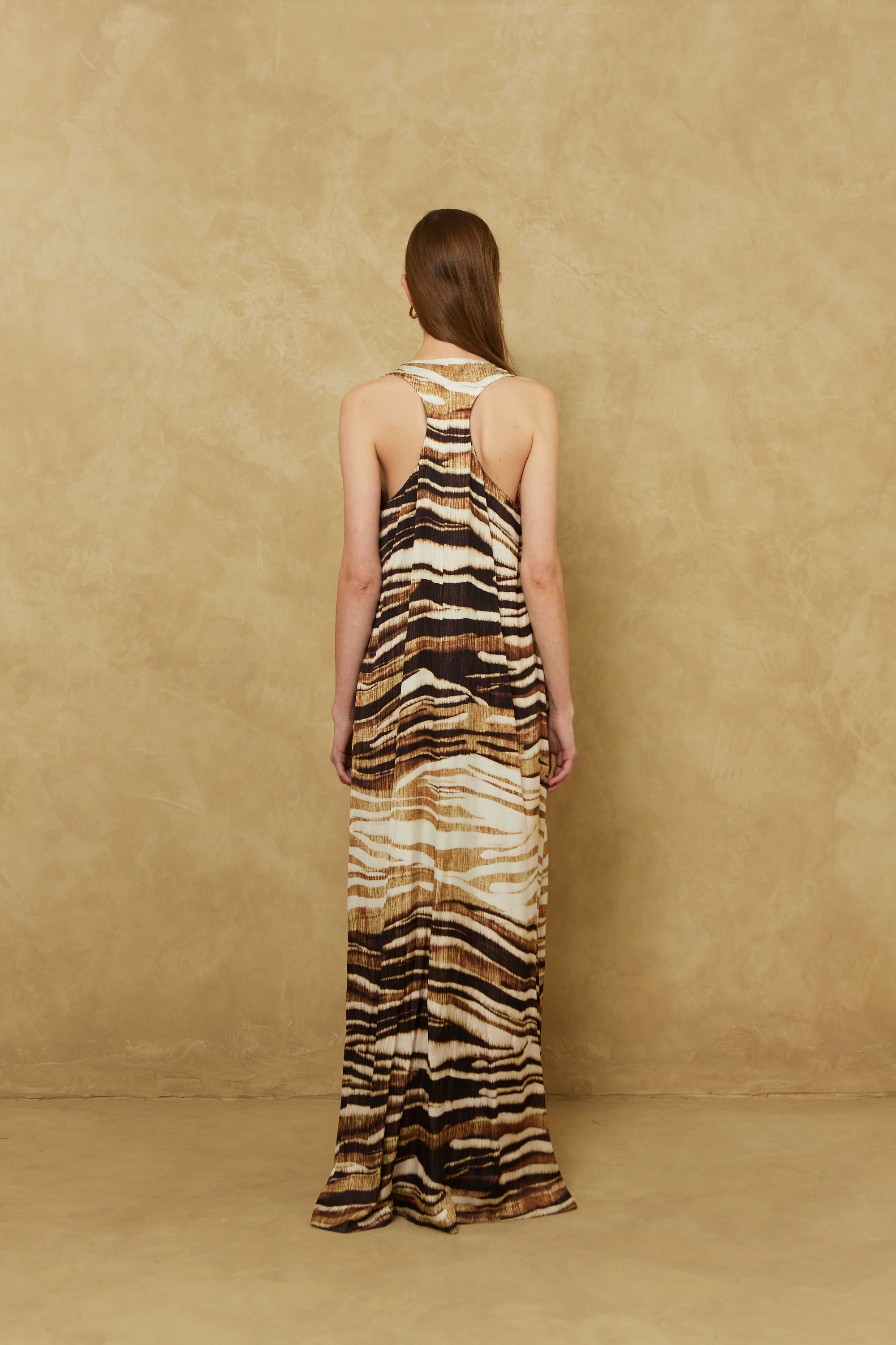 Платье расширенное к низу, с карманами в боковых швах, без рукавов, длинное. По спинке средний шов. Горловина и проймы обработаны обтачкой.