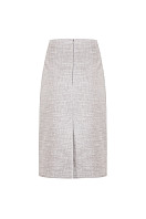 Юбка женская, зауженная к низу, длиной ниже колена, без пояса, на подкладке. Заднее полотнище юбки со средним швом и потайной молнией, в нижней части шлица.