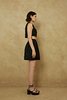 Юбка женская, длиной выше колена, сборка по поясу. В нижней части вставка из отделочной тесьмы кружево. В боковых швах карманы. Застежка спереди на пуговицы.