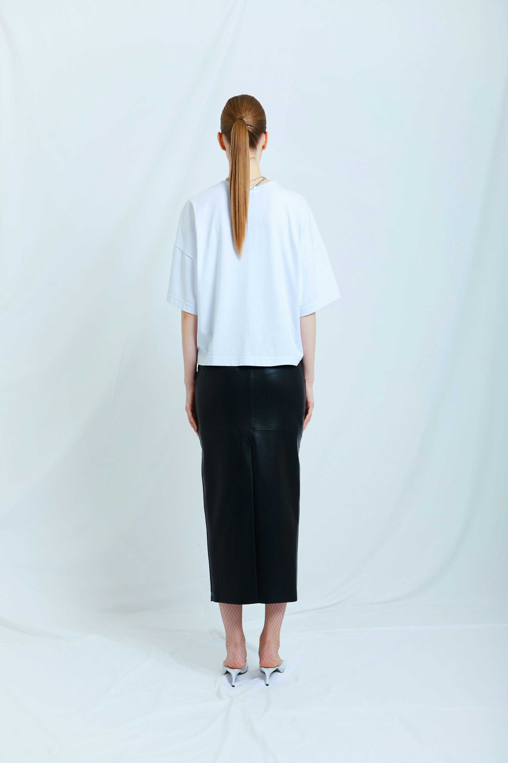 Юбка женская, на подкладке, длиной «миди», зауженная к низу, с фигурными боковыми карманами. Передняя часть юбки со средним швом, в верхней части с застежкой на молнию. На заднем полотнище юбки обработаны прорезные карманы в «рамку». В среднем шве обработана шлица. Верхний срез юбки обработан притачным поясом, застегивающимся на петлю и пуговицу. Отделочные шлевки дополняют дизайнерский замысел юбки.