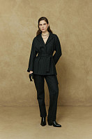 Жакет женский, прямого силуэта, с отложным воротником и лацканами. Рукава цельнокроеные с притачной отложной манжетой. В боковых швах разрезы. Застежка на 2 пришивные кнопки, в комплекте пояс.