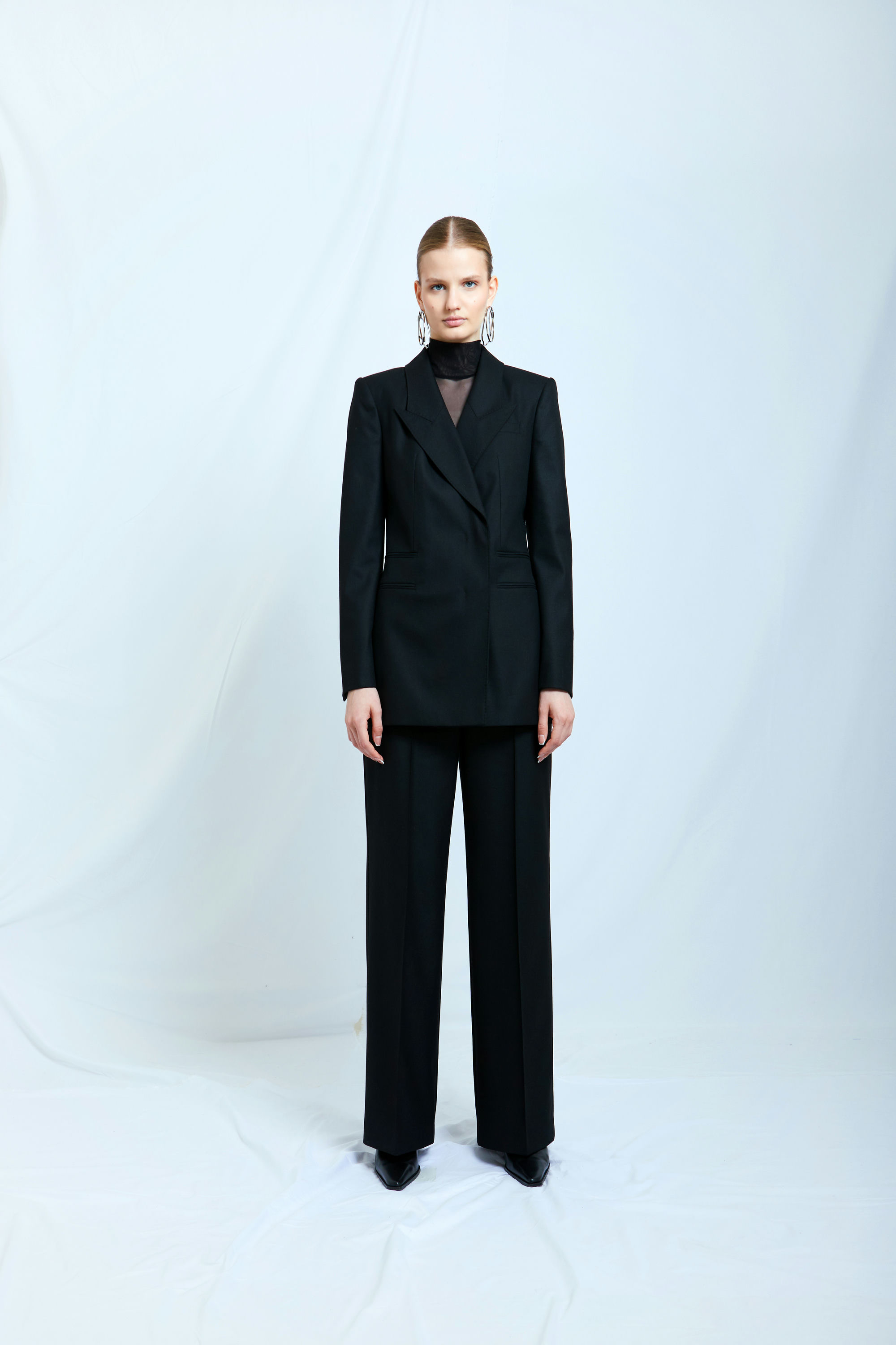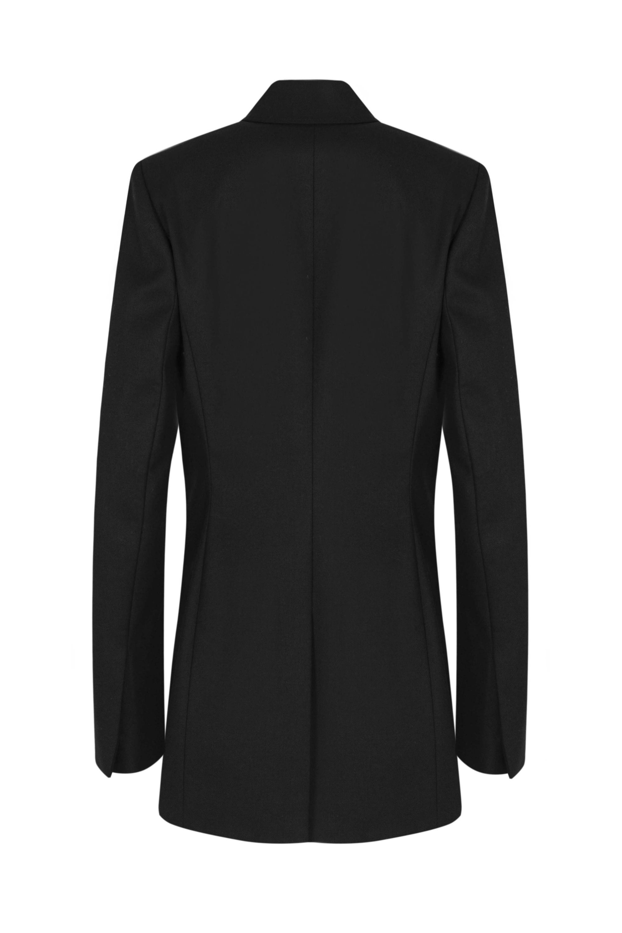 Жакет женский, двубортный, полуприлегающего силуэта, на подкладке. Застежка на пришивные кнопки. На переде карманы «в рамку» - 2 пары. В среднем шве спинки шлица. Рукава втачные, длинные, двухшовные, с отлетной шлицей на 3 пришивные кнопки. Воротник и лацкана отложные. По воротнику, лацканам и бортам отделочная строчка – имитация ручного стежка.
