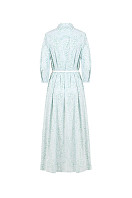 Платье женское, отрезное по линии талии, длиной по щиколотку. Воротник рубашечный. На переде и спинке по талии заложены складки. По переду застежка на петли и пуговицы. Рукав длинный, одношовный, по низу с притачной манжетой, застегивающейся на петлю и пуговицу. Карманы в боковых швах. В комплекте ремень.