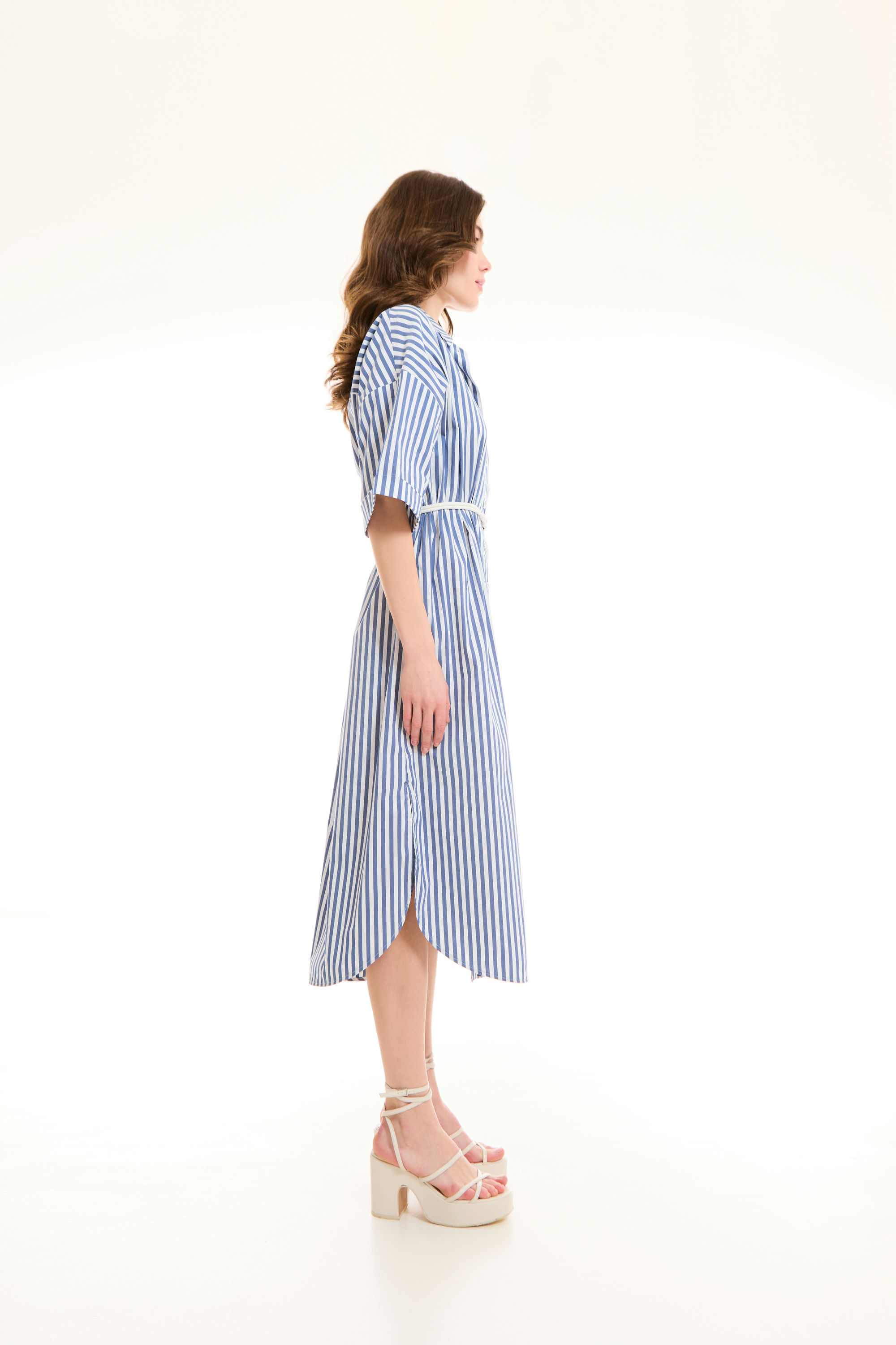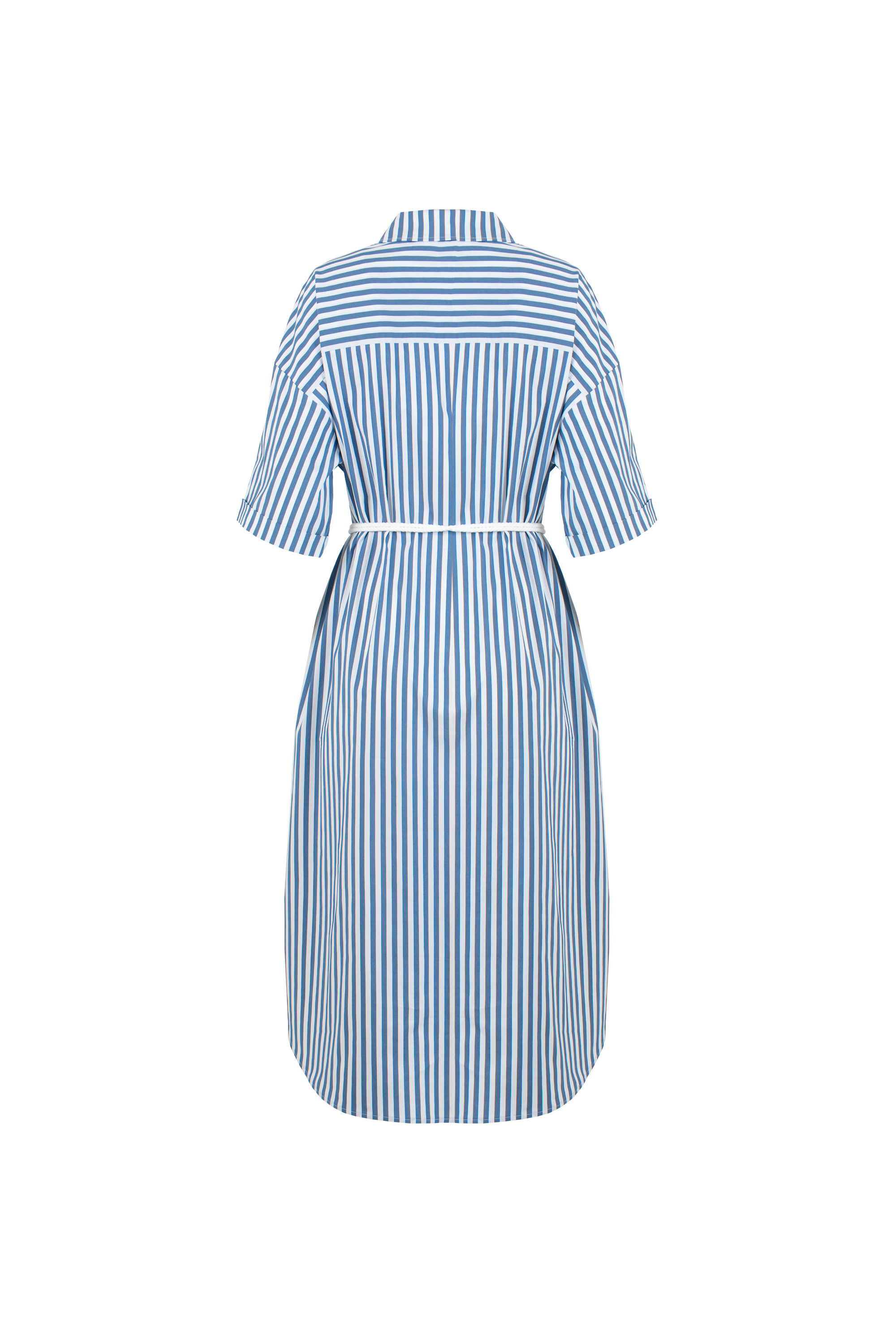 Платье женское, прямого силуэта, длиной ниже колен. Спинка с кокеткой. Карманы в боковых швах. Рукав втачной одношовный. По переду застежка на петли и пуговицы. Воротник рубашечного типа.