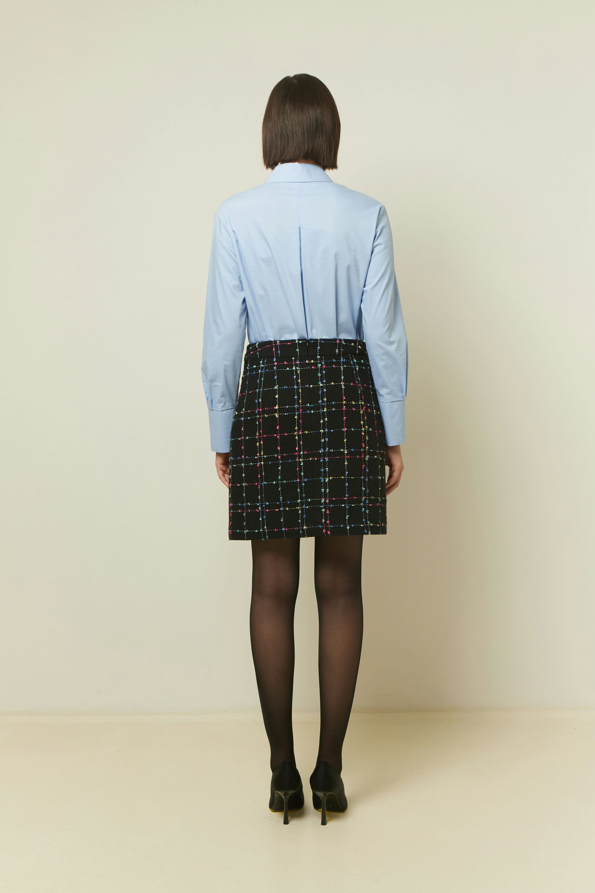 Юбка женская, расширенная к низу, длиной выше колена, на подкладке. Застежка на потайную молнию в среднем шве спинки. Юбка по переду с одним разрезом.