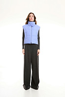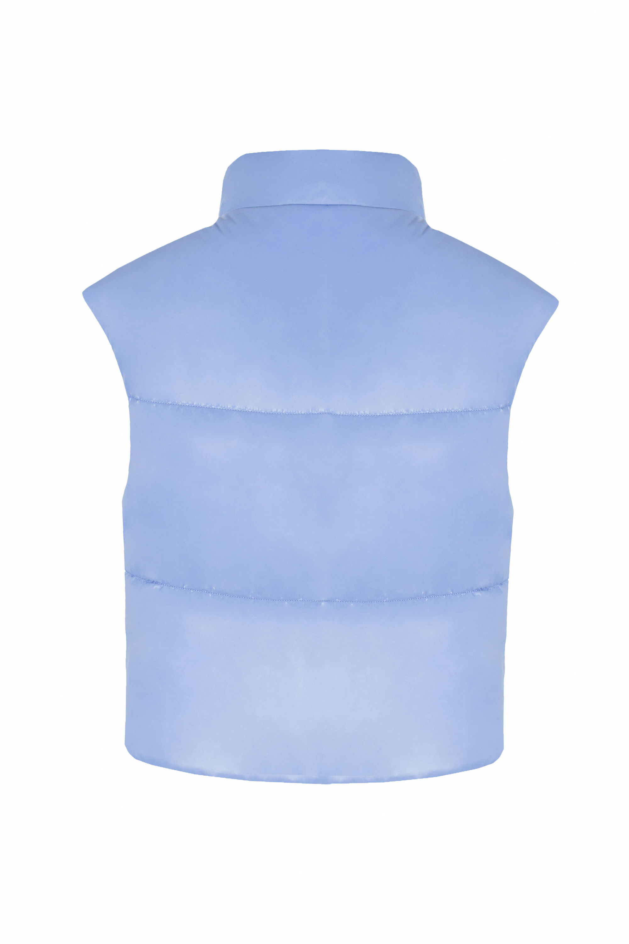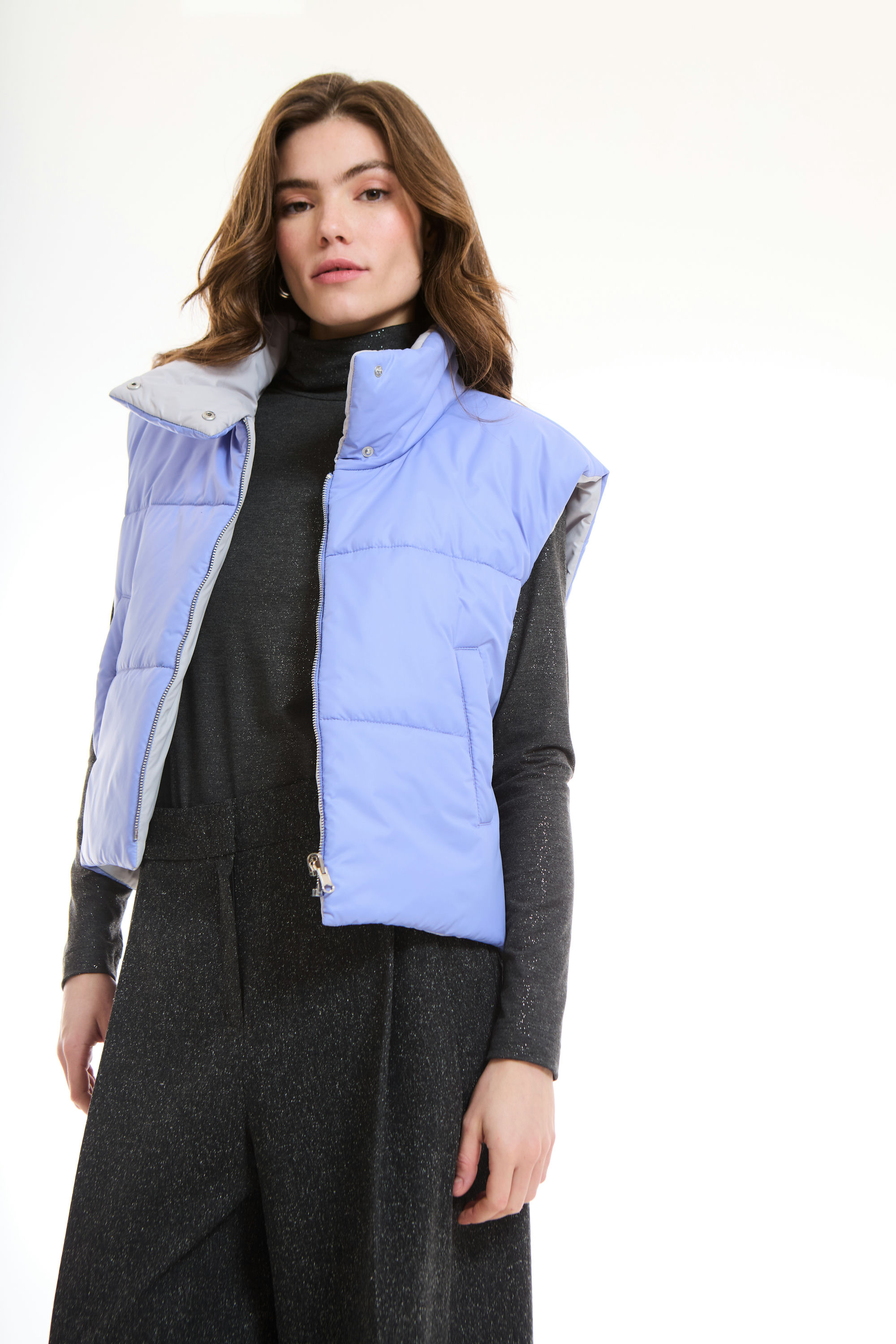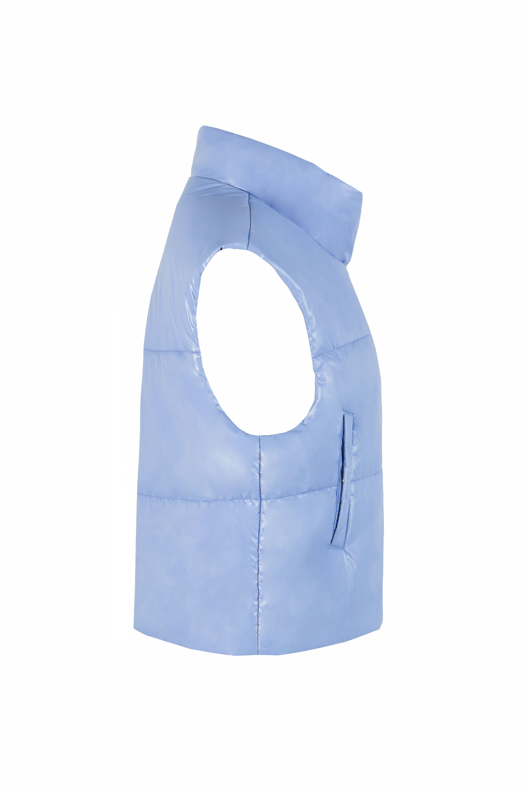 Жилет женский плащевой утепленный укороченный, двусторонний. Перед с застежкой на молнию, карманы на верхе и подкладке – листочка с втачными концами, застегивающаяся на потайную кнопку. Воротник – стойка, застегивается на потайные кнопки.